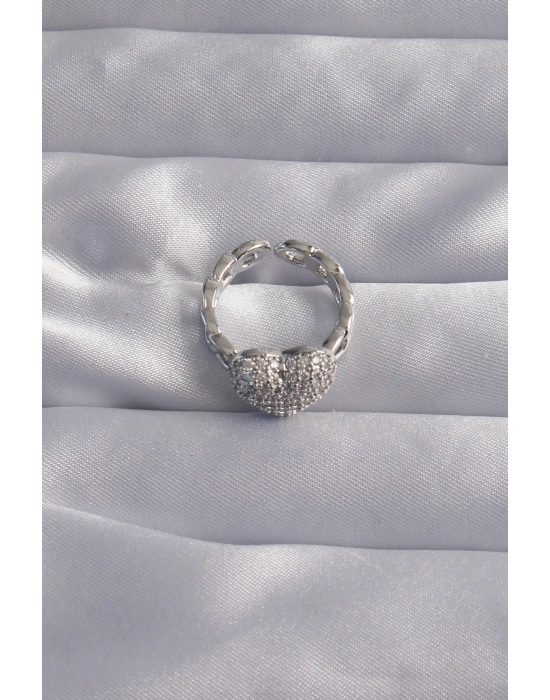 Pirinç Ayarlamalı Gümüş Renk Zirkon Taşlı Bombeli Kalp Yüzük