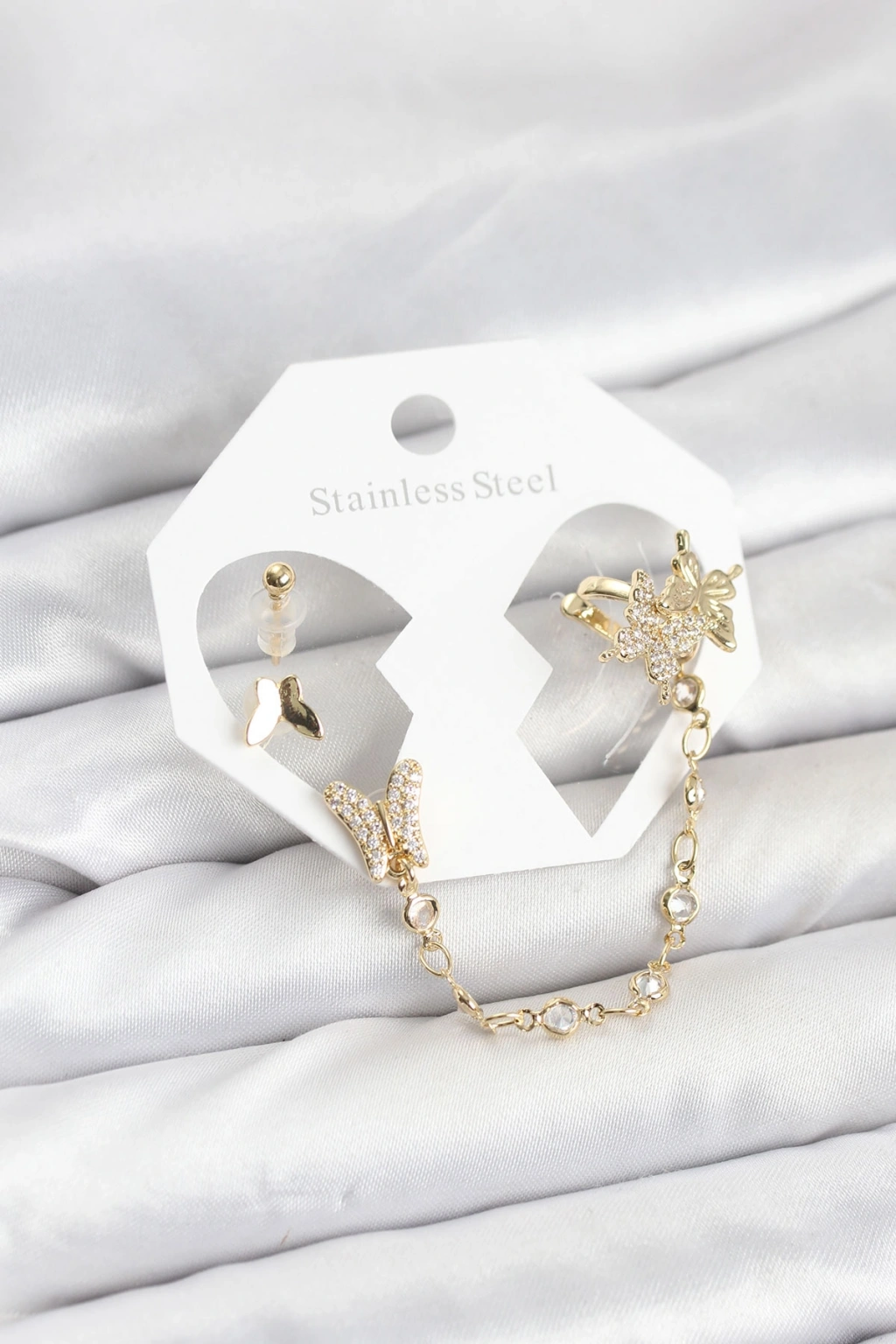 Pirinç Gold Renk Kelebek Model Zincir Bağlantılı Ear Cuff Küpe Seti
