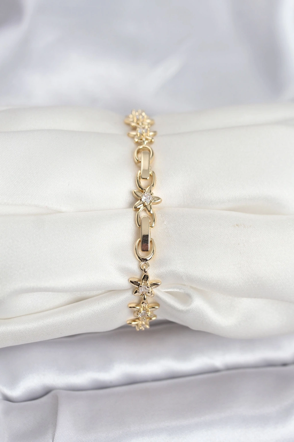 Pirinç Gold Renk VIP Seri Sıralı Taşlı Yıldız Model Zirkon Taşlı Kadın Bileklik