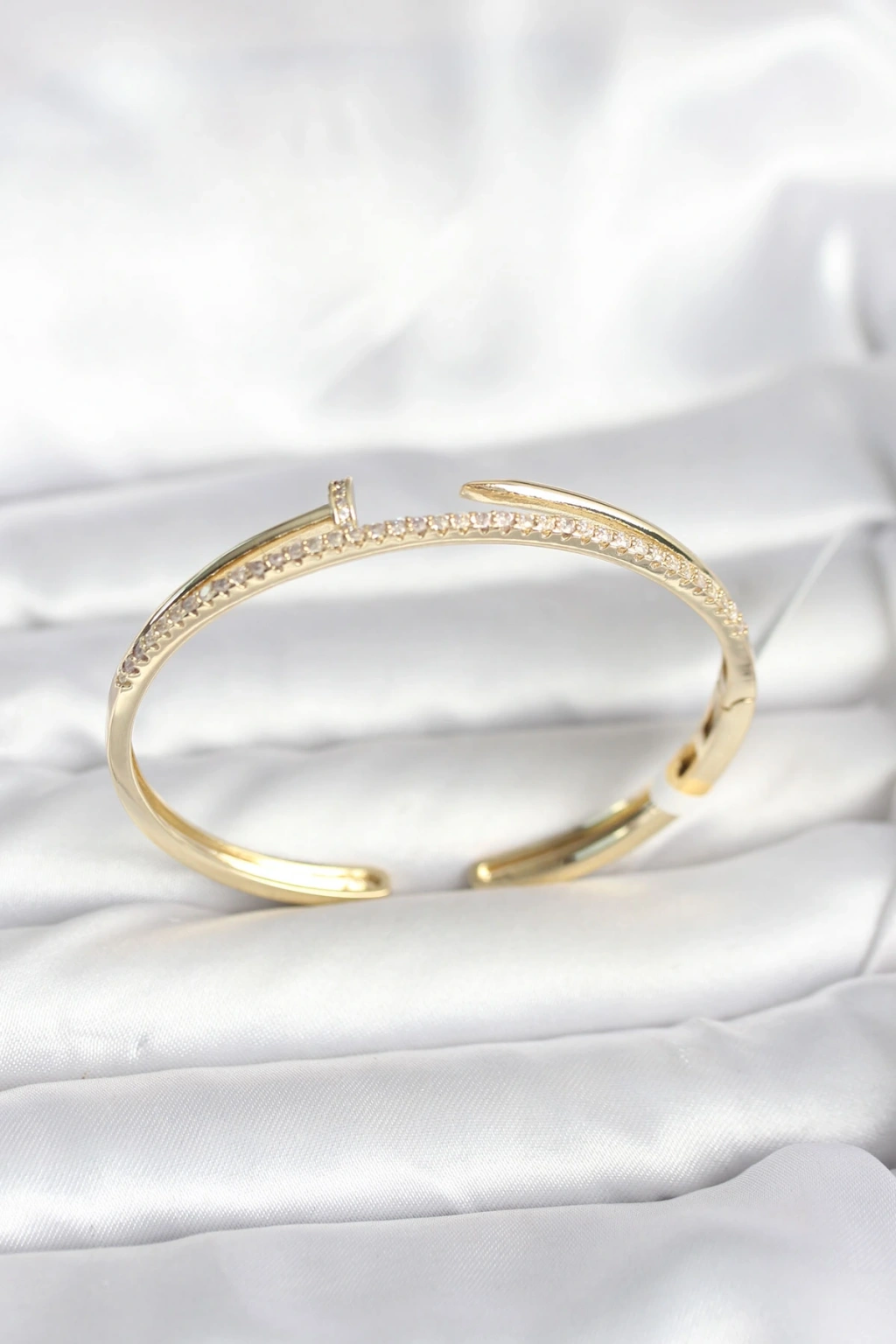Pirinç Gold Renk Zirkon Taşlı Çivi Model Kadın Kelepçe Bileklik