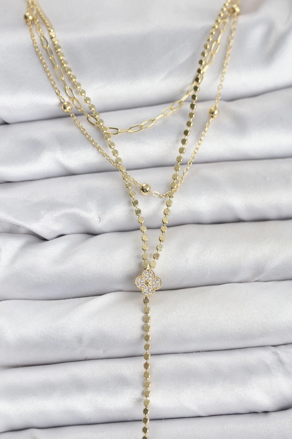 Pirinç Gold Renk Zirkon Taşlı Yonca Model Detaylı 3'lü Kombin Y Kadın Kolye