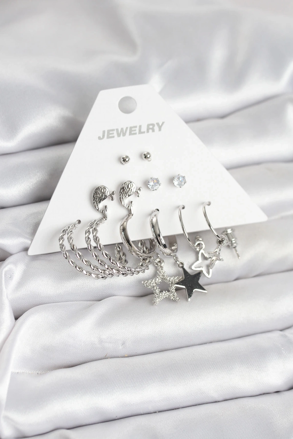 Pirinç Gümüş Renk 6'lı Kadın Küpe Seti