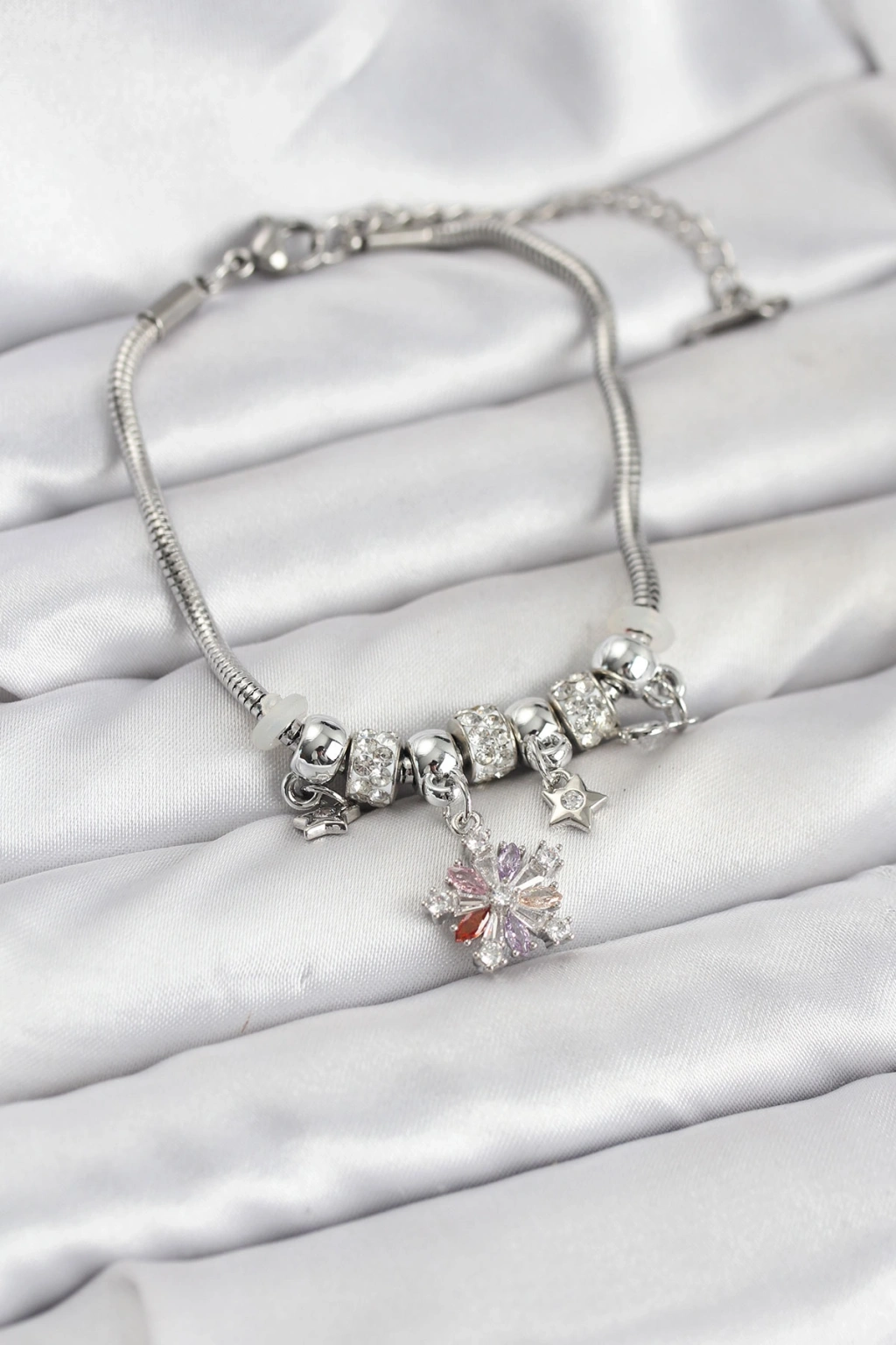 Pirinç Gümüş Renk Renkli Yıldız Charmlı Kadın Bileklik