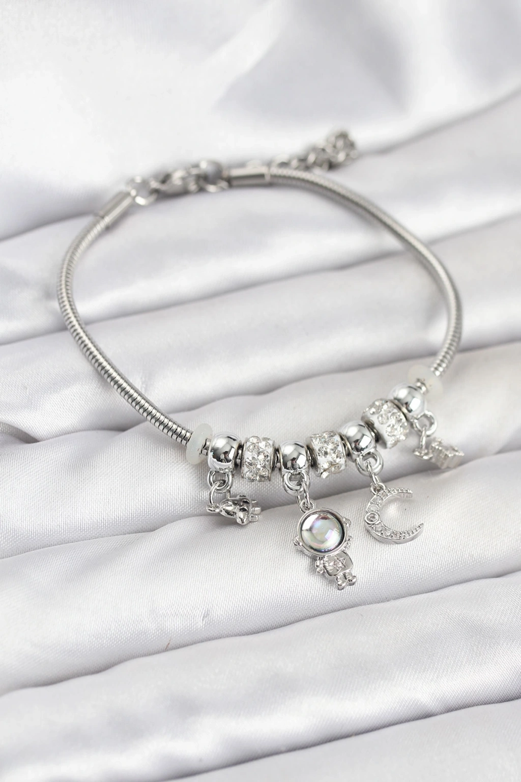 Pirinç Gümüş Renk Uzay Tema Charmlı Kadın Bileklik