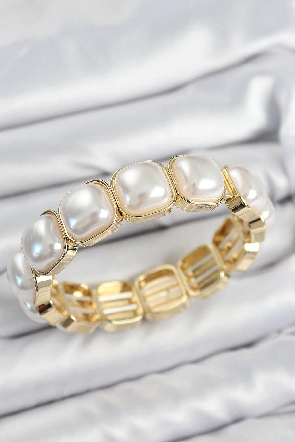 Pirinç Kare İnci Model Gold Renk Lastikli Kadın Bileklik