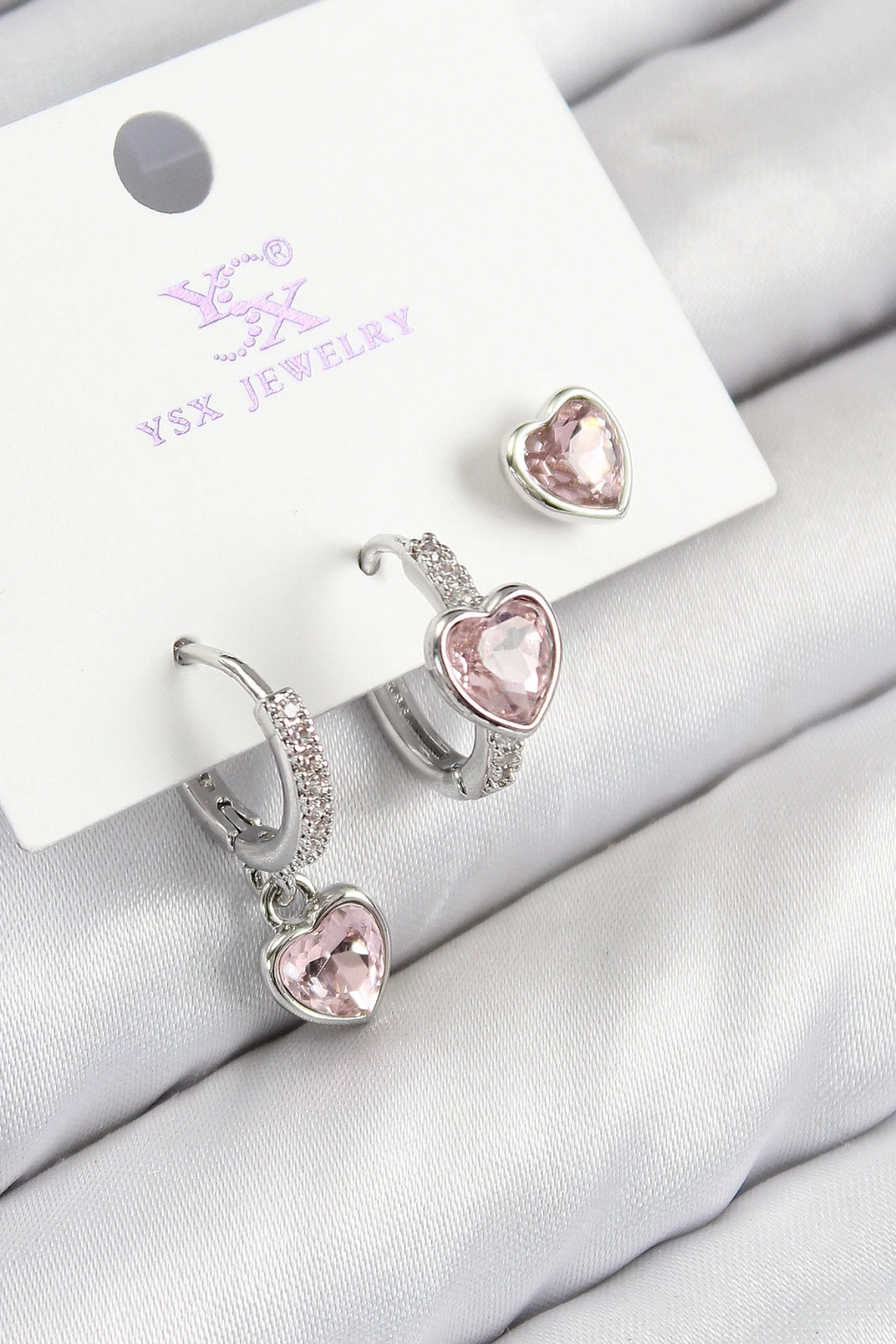 Pirinç Zirkon Taşlı 3'lü Pembe Kalp Model Gümüş Renk Kadın Küpe