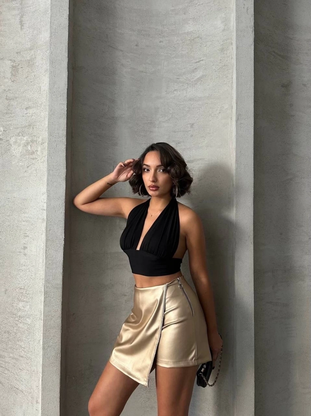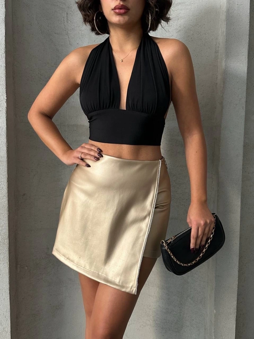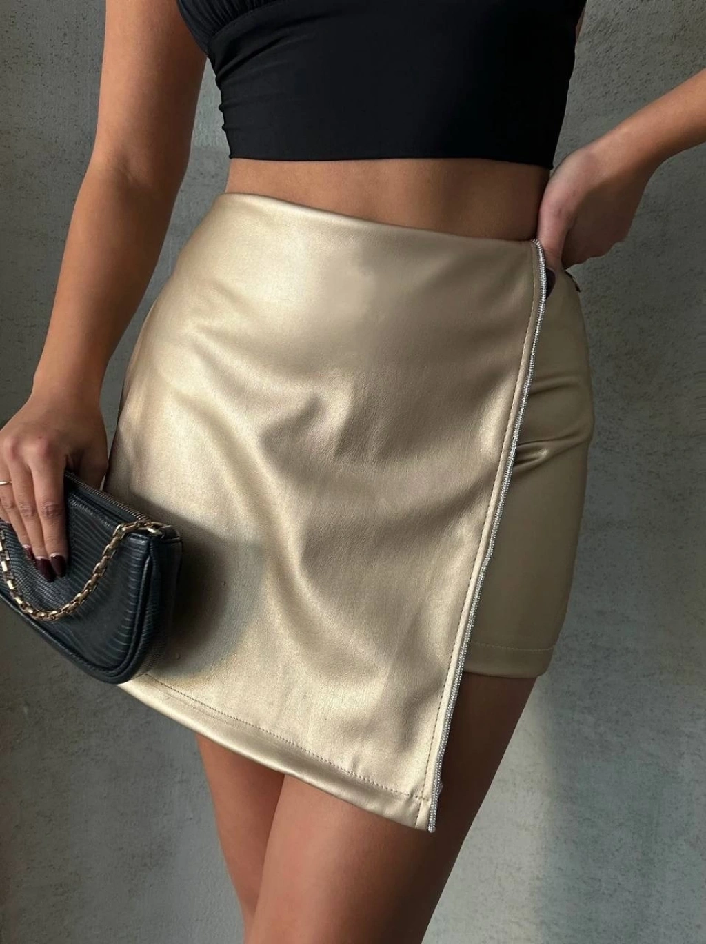 Beli lastikli çıtçıtlı deri şort krem w241007