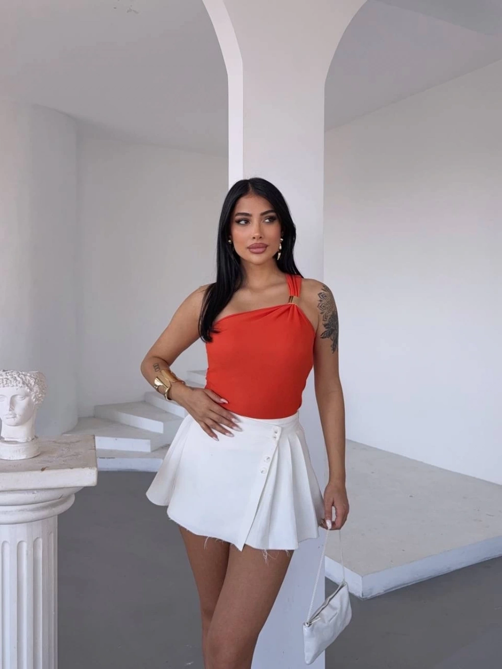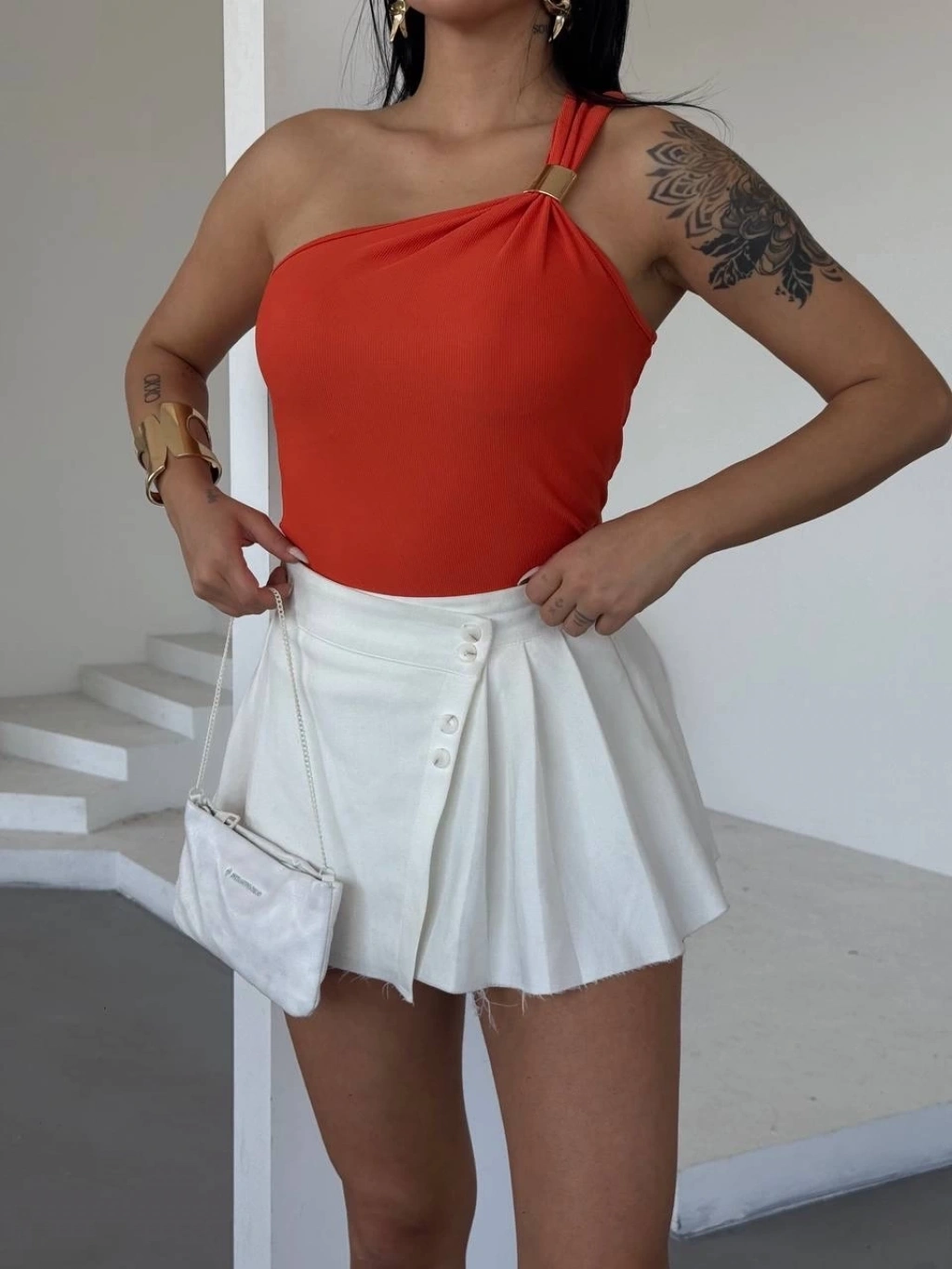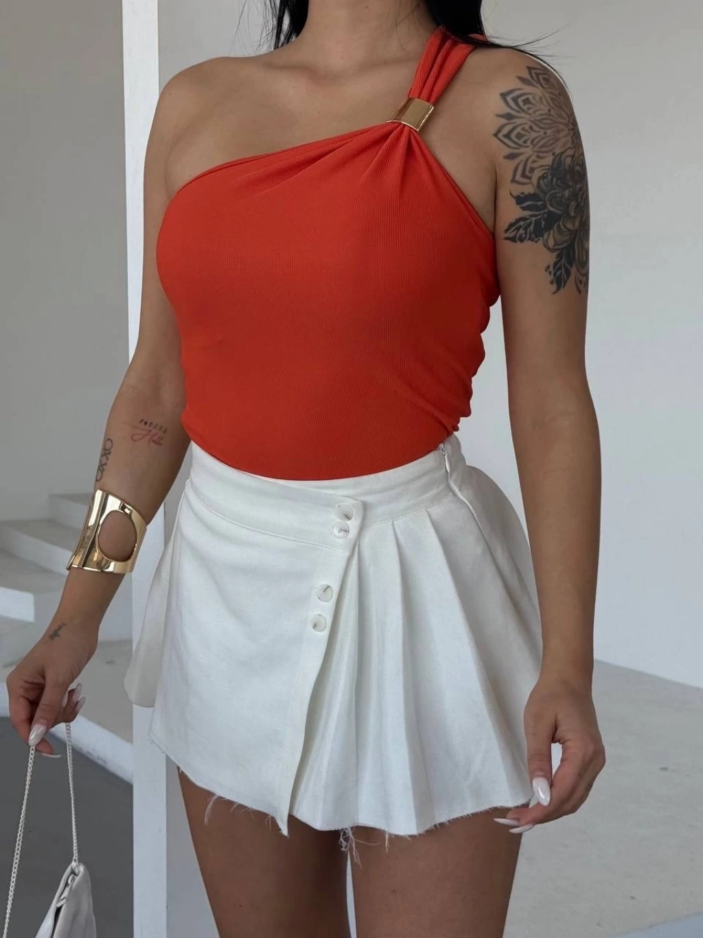 Tek omuzlu Otoman kumaş gold metal detaylı bluz s2311