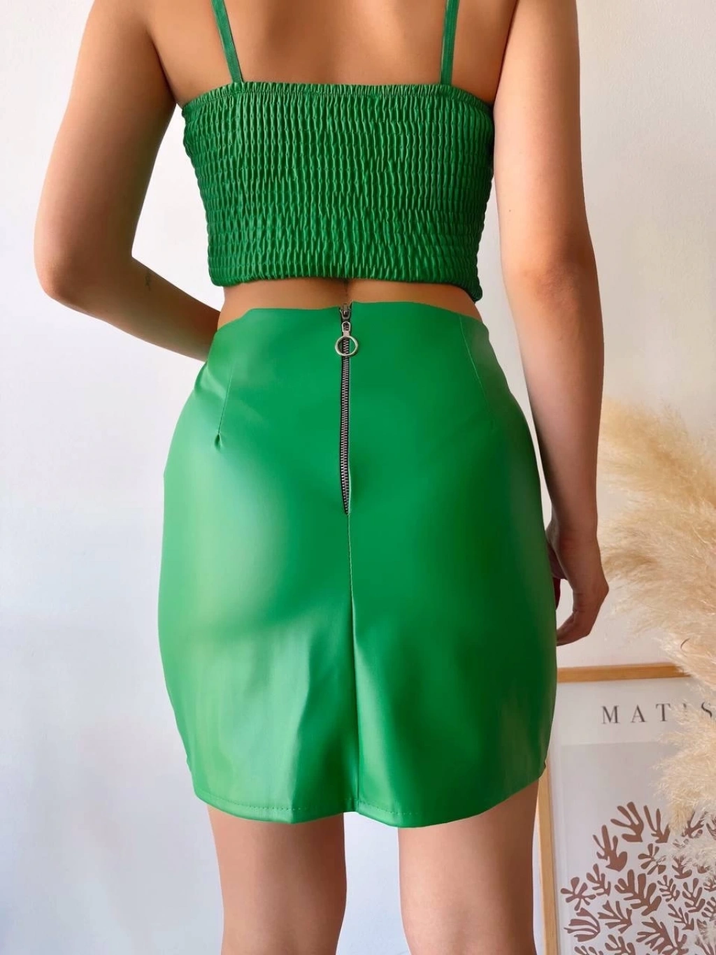 Tek yırtmaçlı arkadan fermuarlı deri etek yeşil s24475