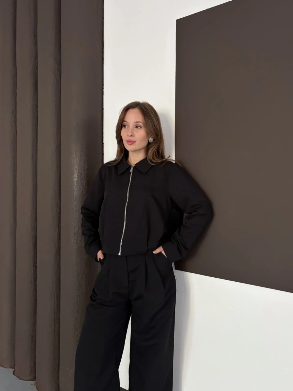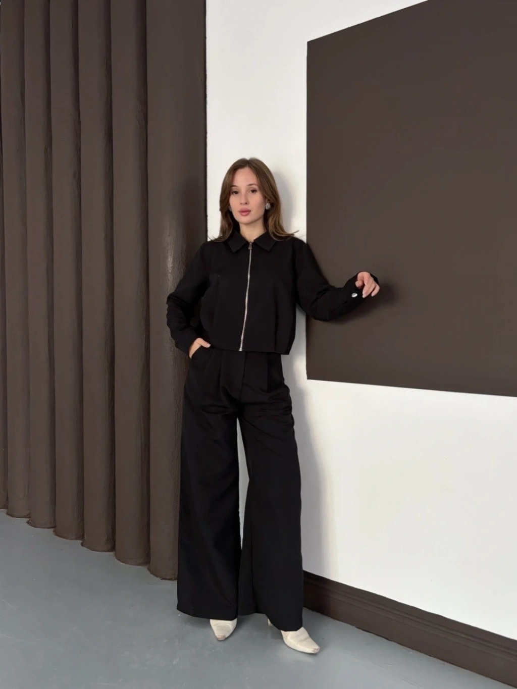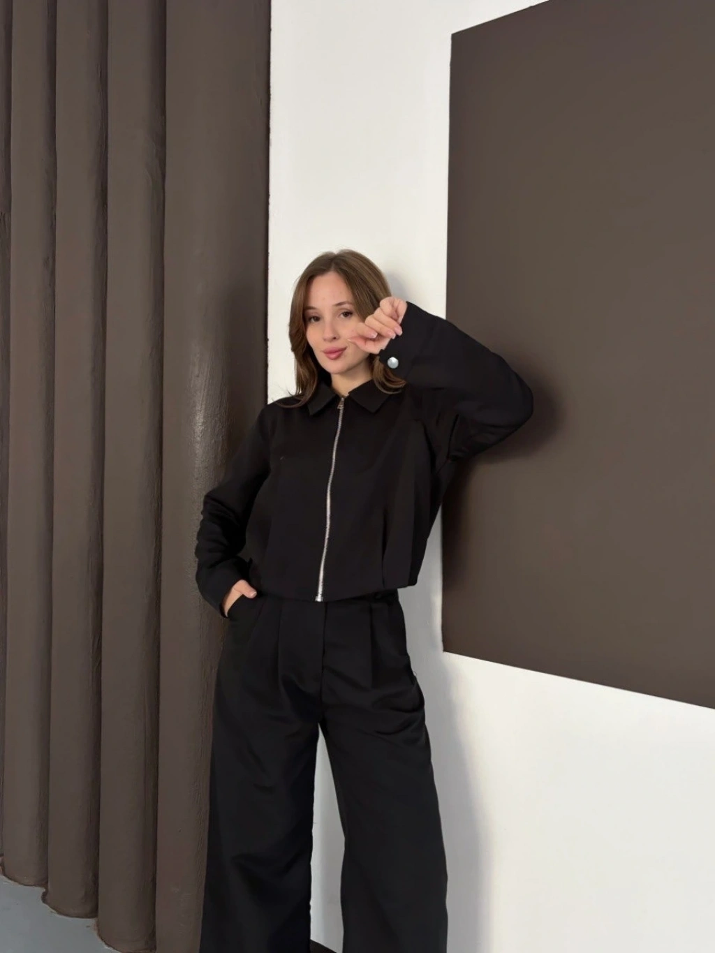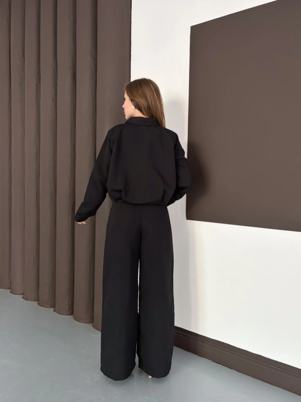 Gömlek yaka kaplama düğmeli takım kahve st265866