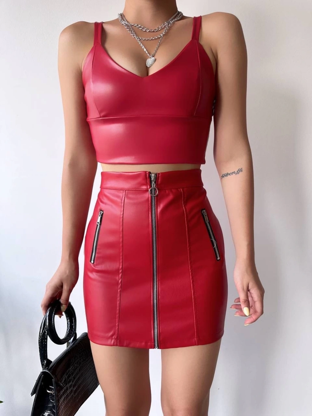 Üç fermuarlı deri etek bordo s24510