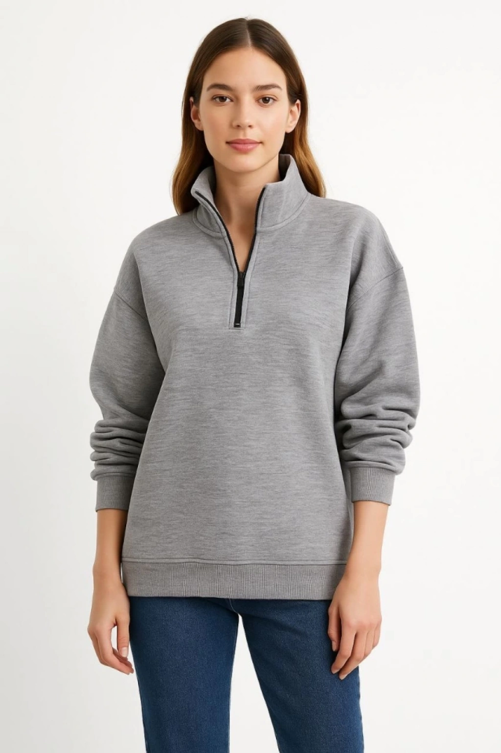 Üç İplik Dık Yaka Yarım Fermuarlı SweatShirt - Gri