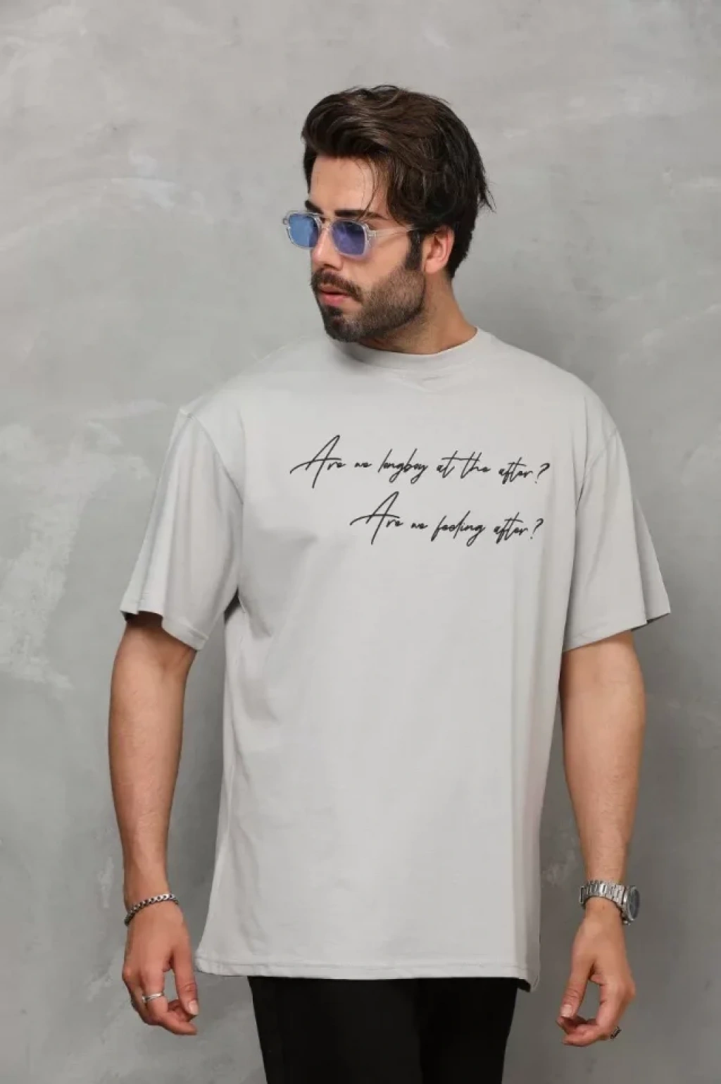 Unisex Bisiklet Yaka Baskılı Oversize T-Shirt - Gri