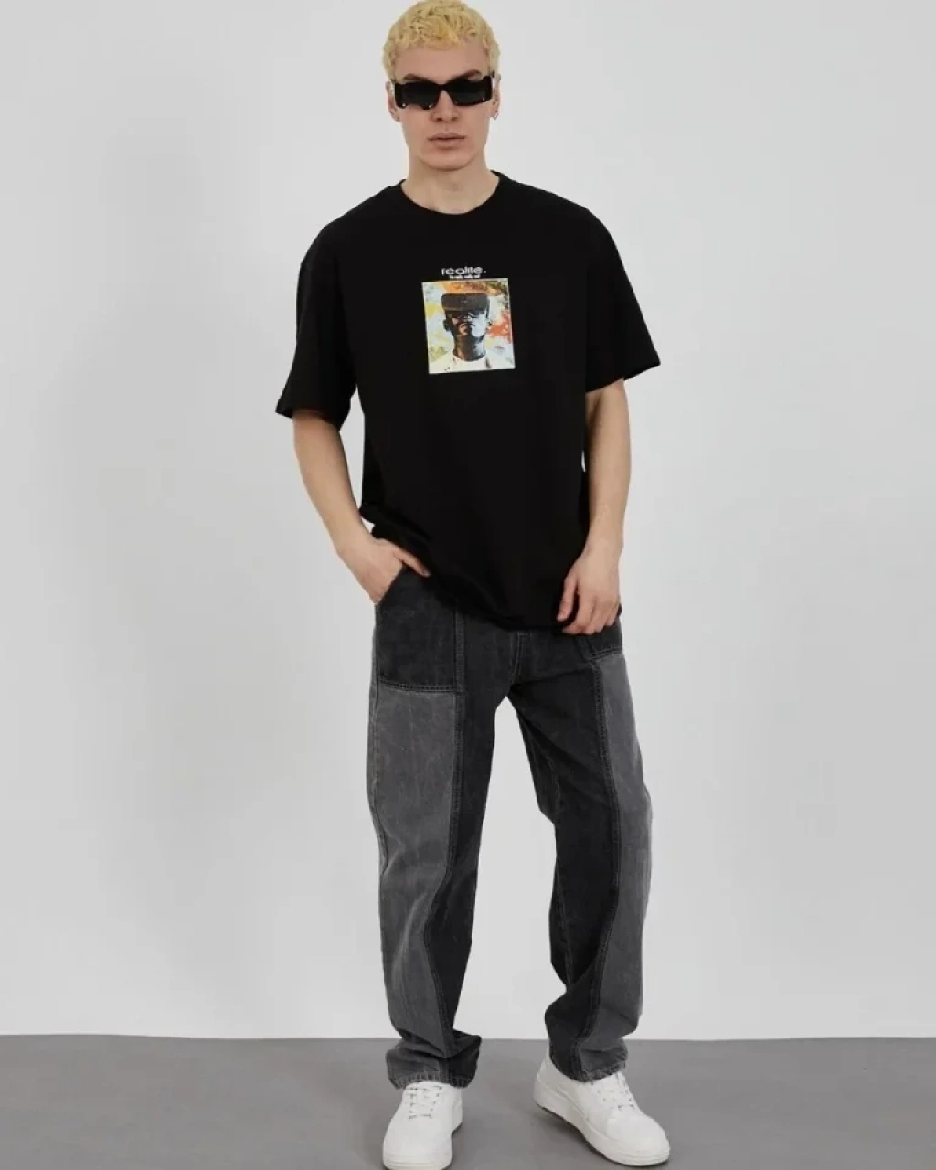 Unisex Bisiklet Yaka Baskılı Oversize T-Shirt - Siyah