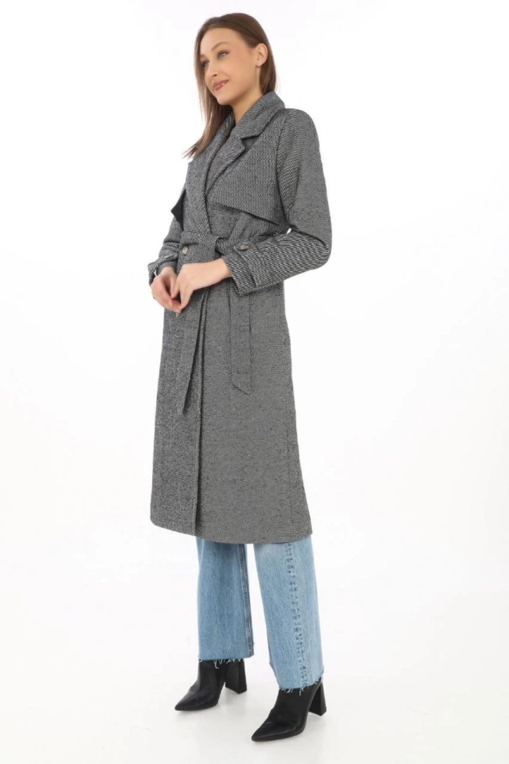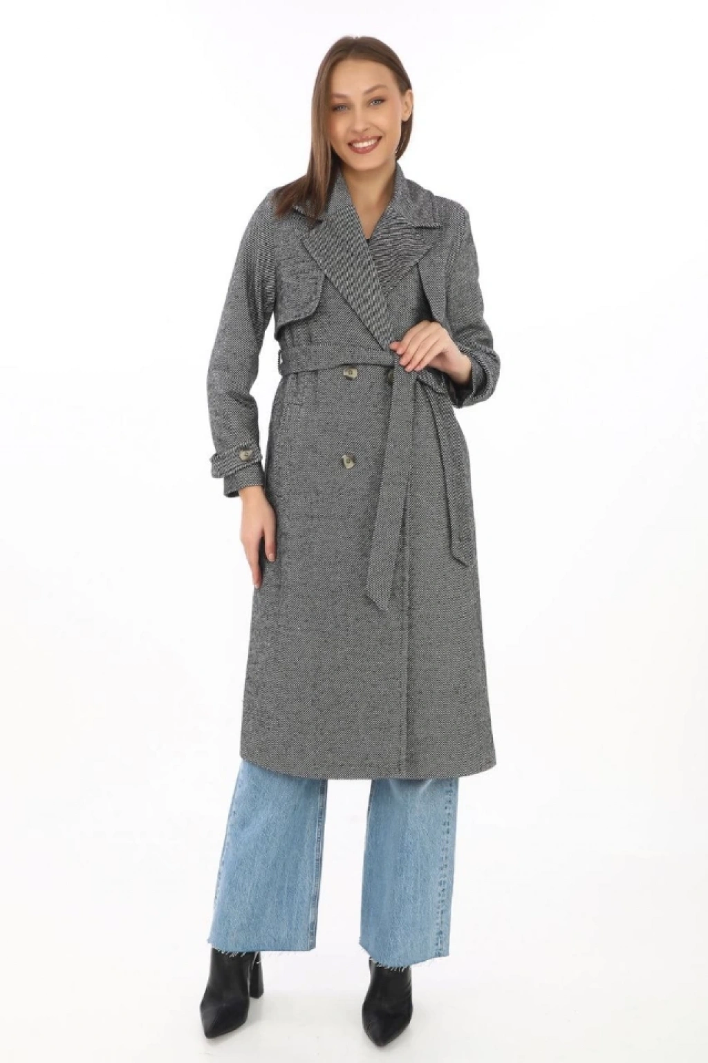 Uzun Kaşe Kaban – Balık Sırtı Dokuma Kaşmir Kumaş, Kruvaze Yaka, Kuşaklı Cepli Model, Oversize Rahat Kalıp - Boyalı Gri