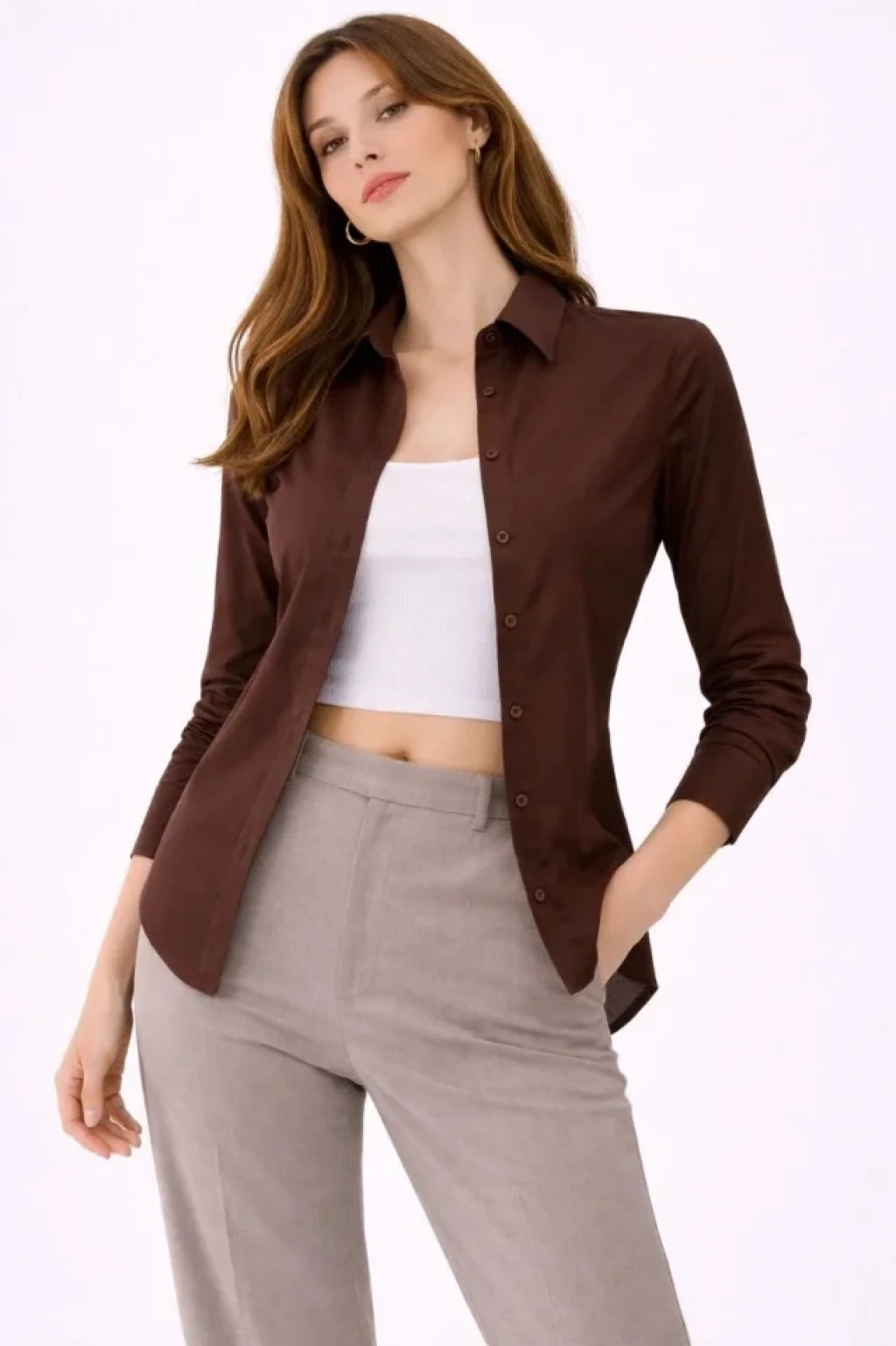 Uzun Kollu Gömlek Düğmeli Klasik Yaka Günlük Ve Ofis Şıklığına Uygun - Kahverengi