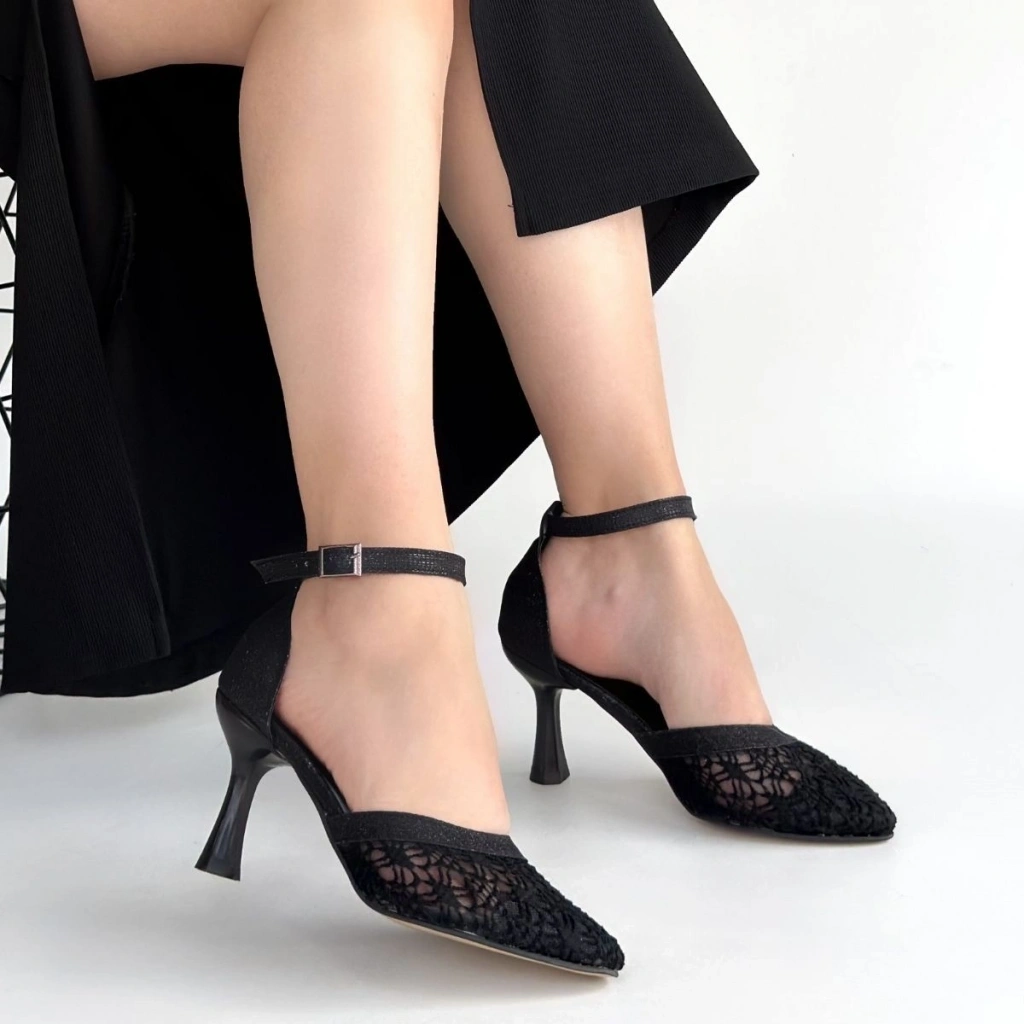 Poje Siyah Saten Tül Detaylı Topuklu Ayakkabı
