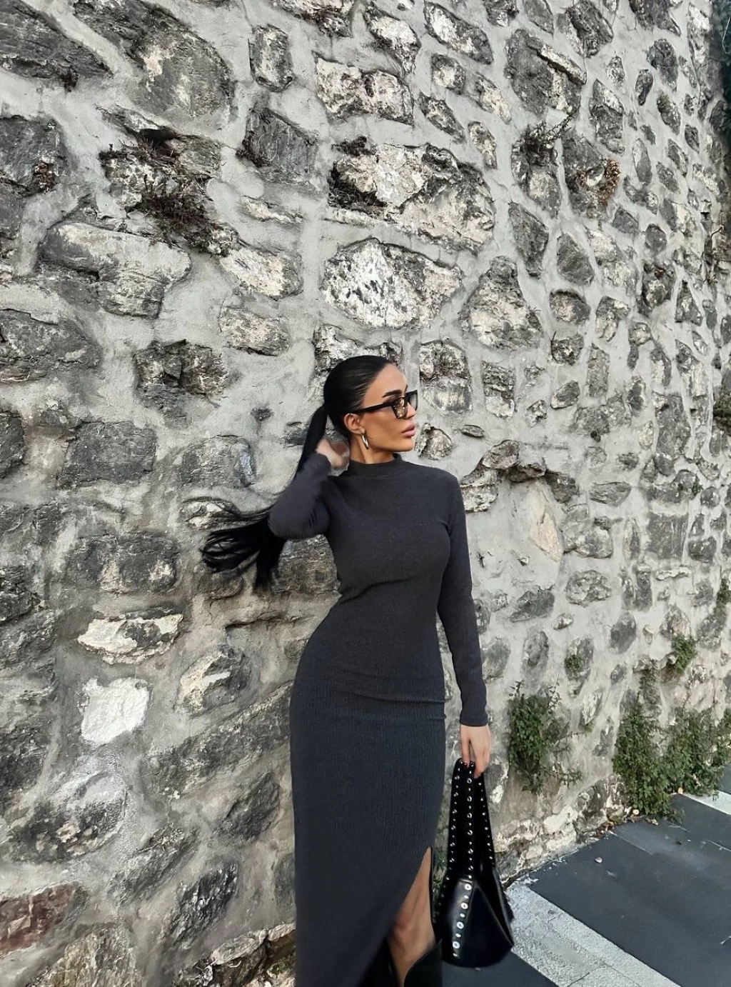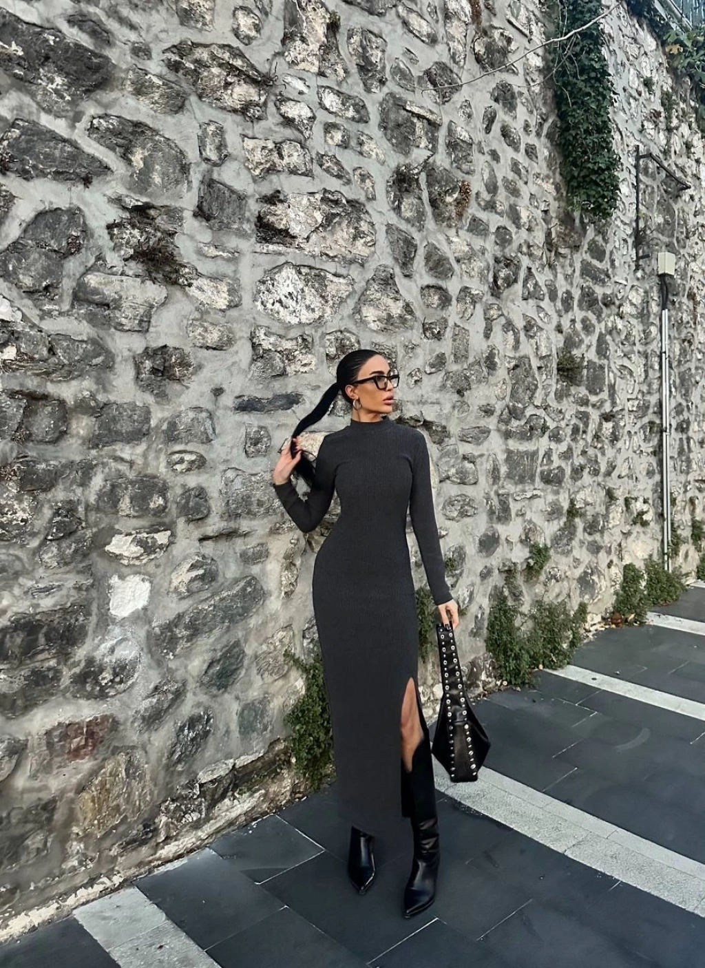 Yırtmaçlı kalın bürümcük uzun elbise siyah