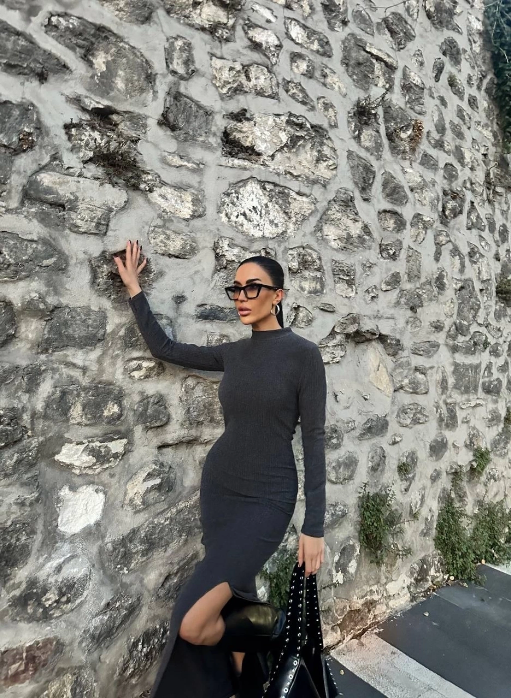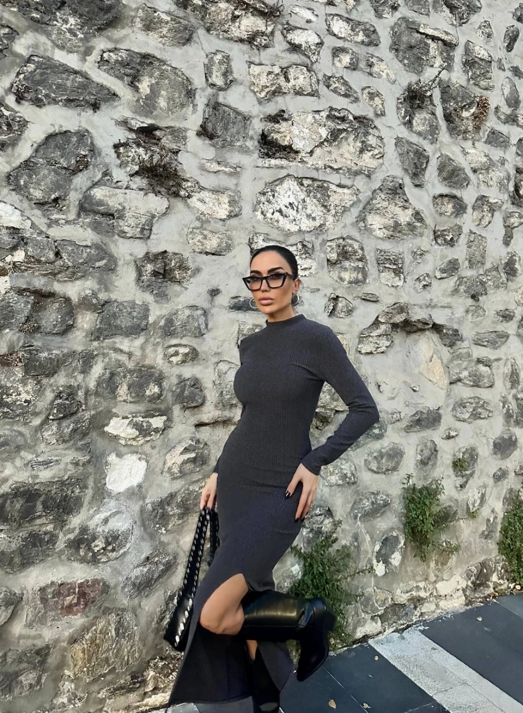 Yırtmaçlı kalın bürümcük uzun elbise vizon